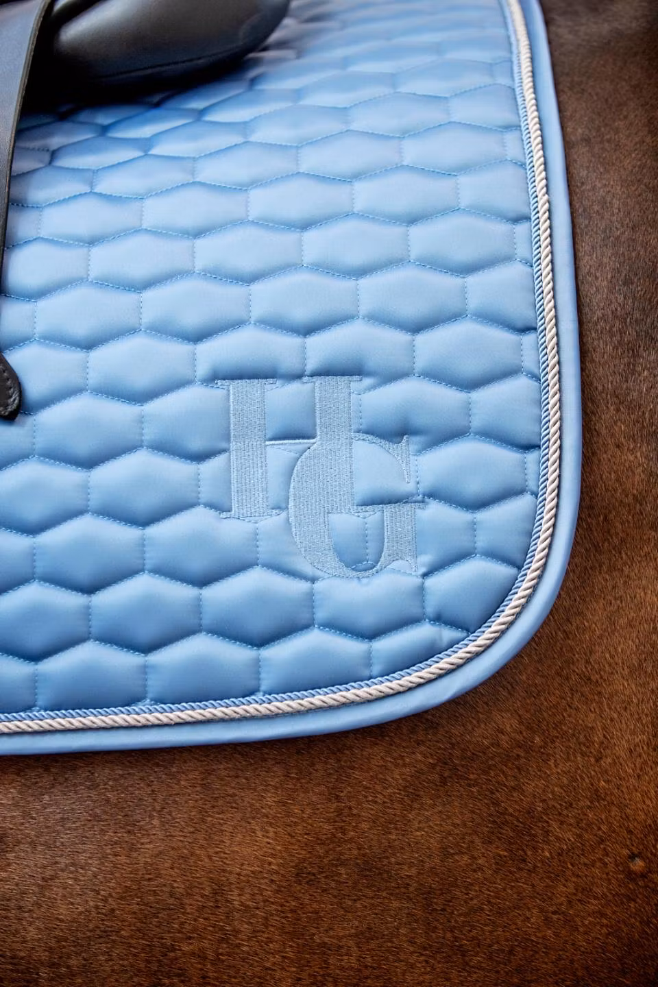 Fint schabrak i ALLROUND/FULL med HG-logotyp quiltning Tvinnat kantband med glitter 3-rums baksnöresrem för dressyrform & 1-rums baksnöresrem med kardborre för allroundform Vävd ton-i-ton logotypetikett vid baksnöresrem Fukttransporterande, andningsbar Coolmax-foder