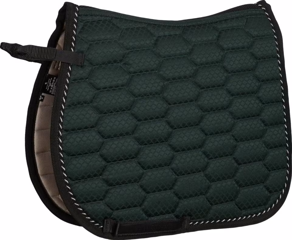 Sadelpadd med sportig look, honungsskonstruktion tyg och dekorativ quiltning. 3D-meshrygg för ventilation. Dekorativ piping i ljusare färg och mörk kantning vid kanterna. Fuktavvisande, andningsbart Coolmax-foder. Gärdesrem med 3 fack för dressyrform & gärdesrem med 1 fack och kardborre för allroundform. Vävd ton-i-ton logotypetikett på gärdesrem.