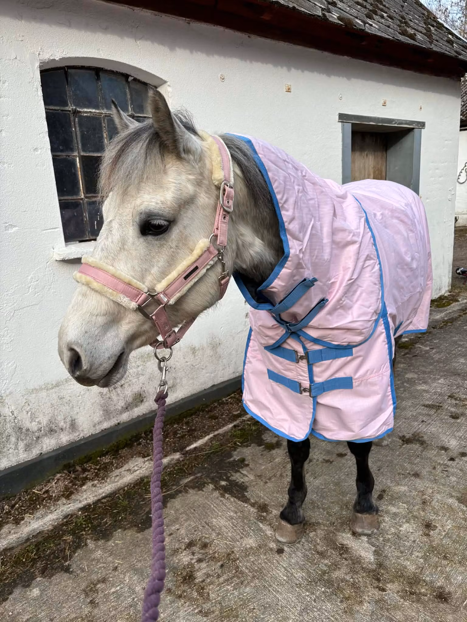 Utetäckegångstäcke Unique (samma passform som Lippo) i rosa med ljusblå kanter som är fodrat med 50 gr i 600D. Avtagbar hals, justerbara kryssgjordar, bogveck och svanssnöre.