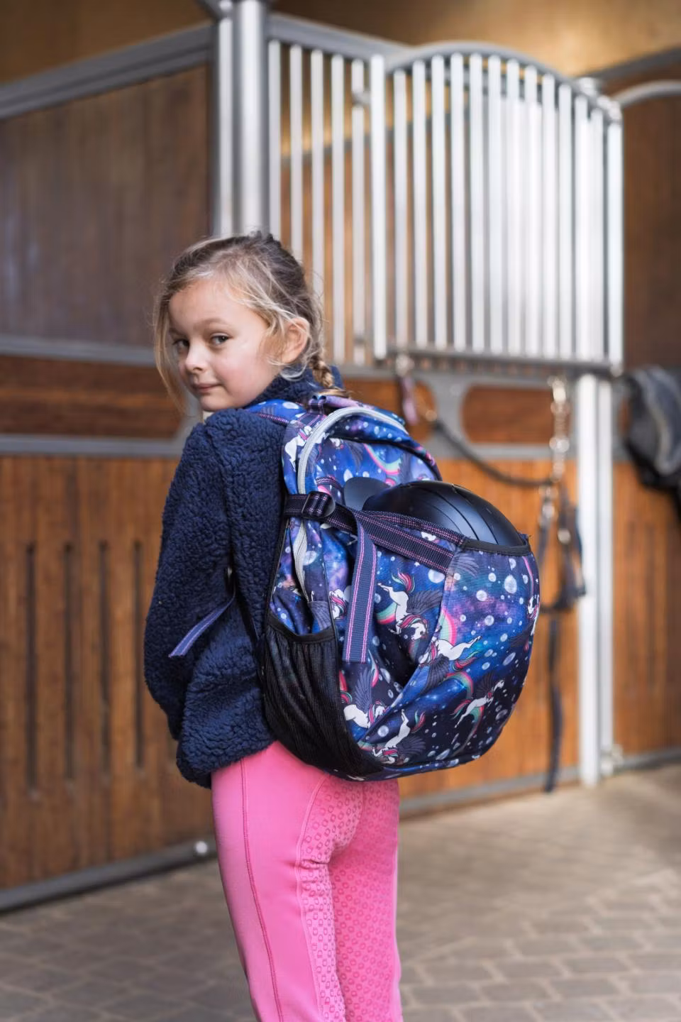 Barnryggsäck med vadderade, justerbara axelremmar och vadderad baksida. Fack som stängs med blixtlås. Meshficka för vattenflaska på ena sidan och plats för din hjälm och piska. Lekfullt heltryck som passar perfekt med alla EQ & HG KIDS-artiklar för denna säsong. Band med glitterränder och det glittriga silverblixtlåset. Mått ca: höjd 38 cm, 31 cm bred nederst, 25 cm bred överst, 12 cm djup nederst, 9 cm djup överst.